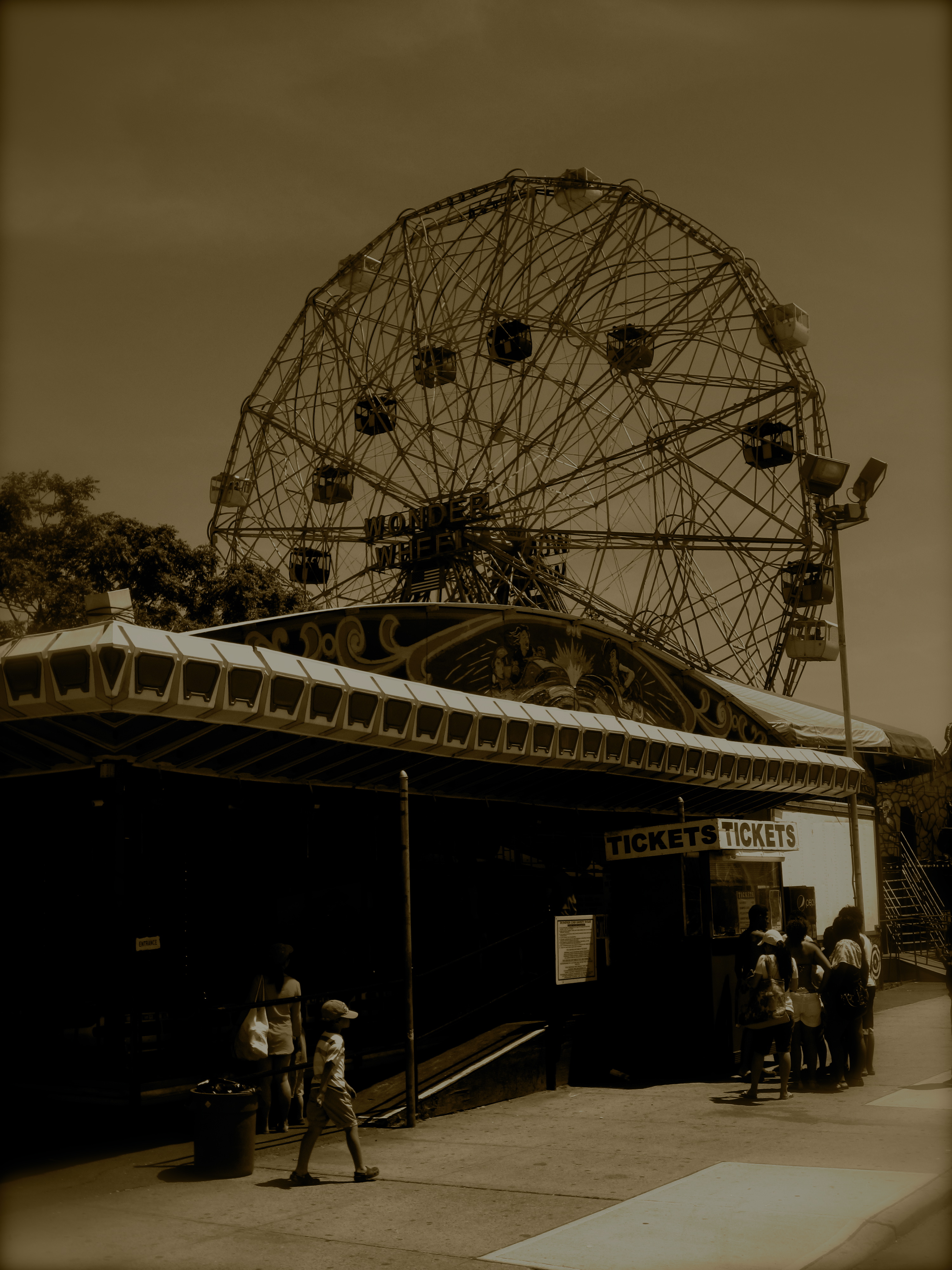 The shops and rides, with their hand painted look, especially when compared to modern rollercoasters. Its a vintage charm that gives Coney Island character.