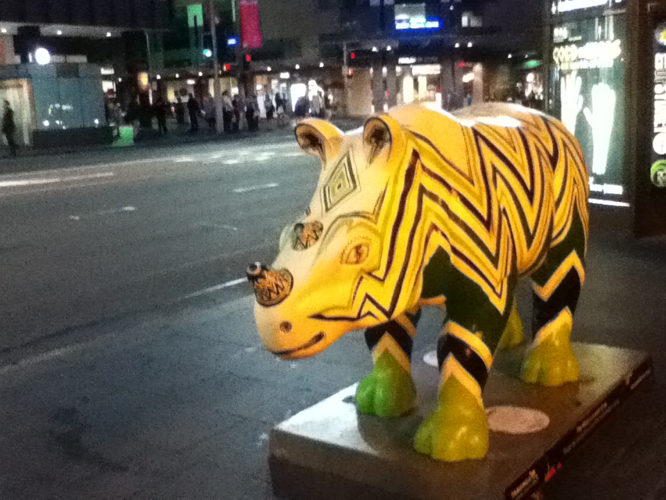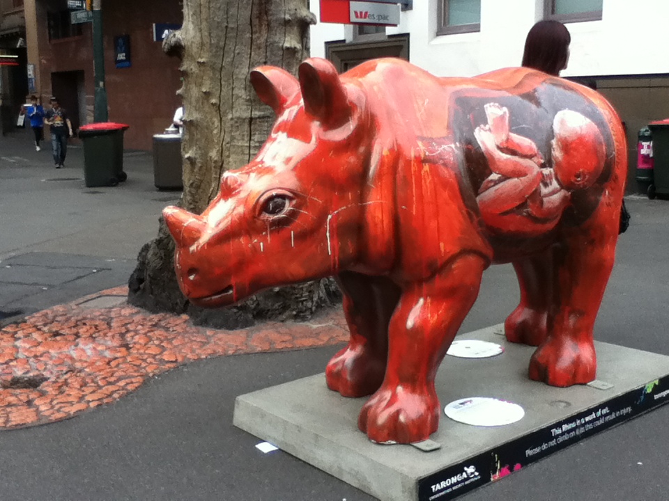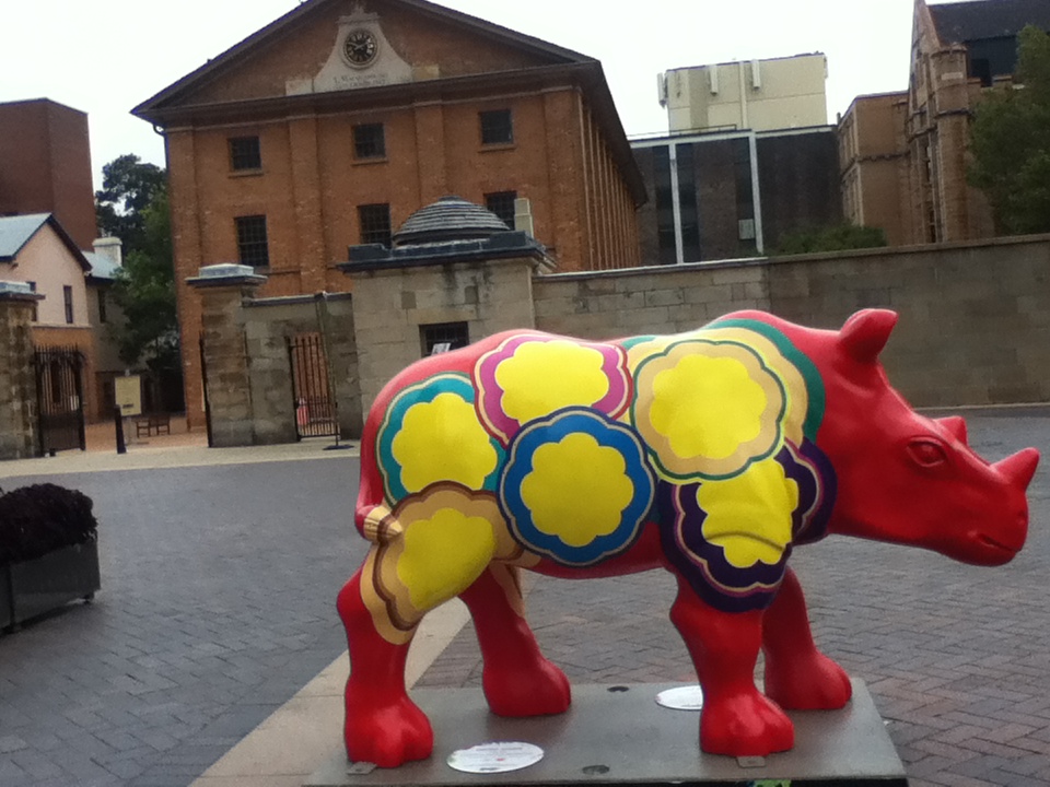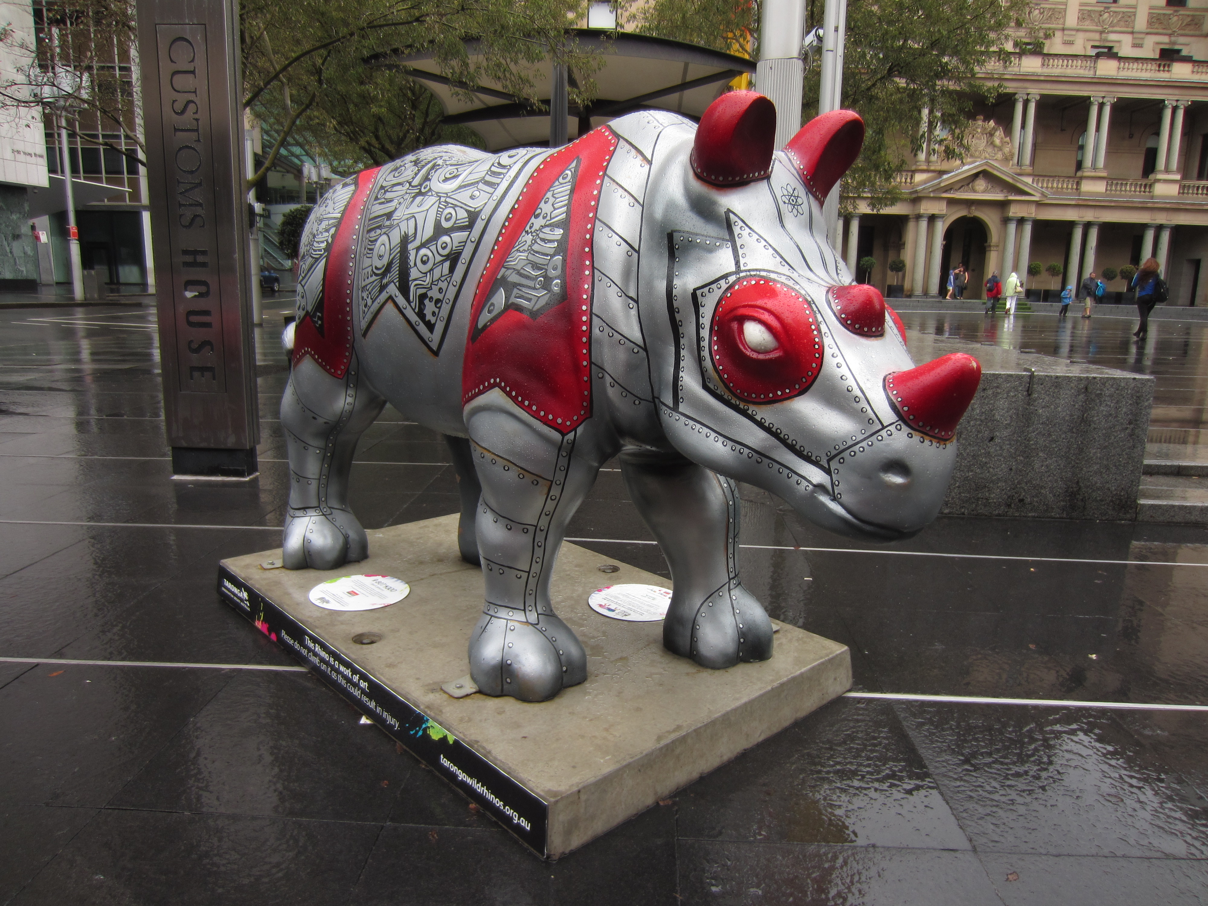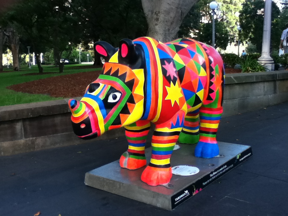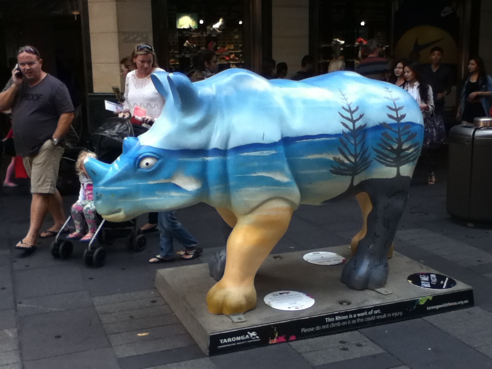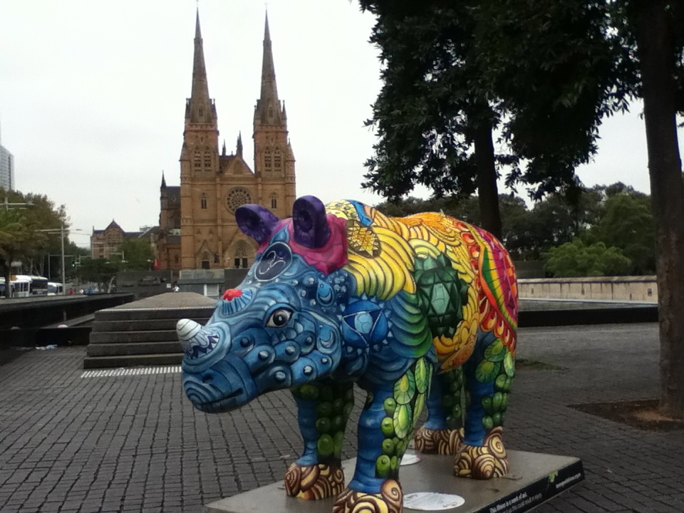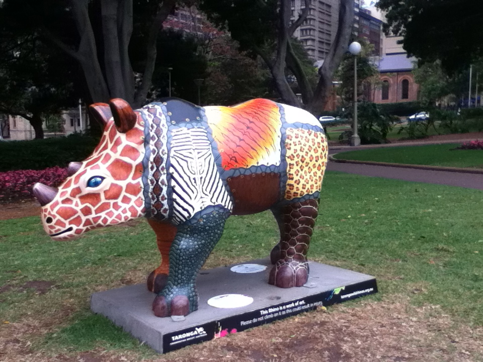 Colourful rhino sculptures started appearing all around Sydney one day. There were Opera house rhinos, Circular Quay rhinos, Botanic Garden rhinos. Some were brightly coloured and dazzling geometric designs, others were painted as robots, some were covered in gold, and others were calming beach landscapes.