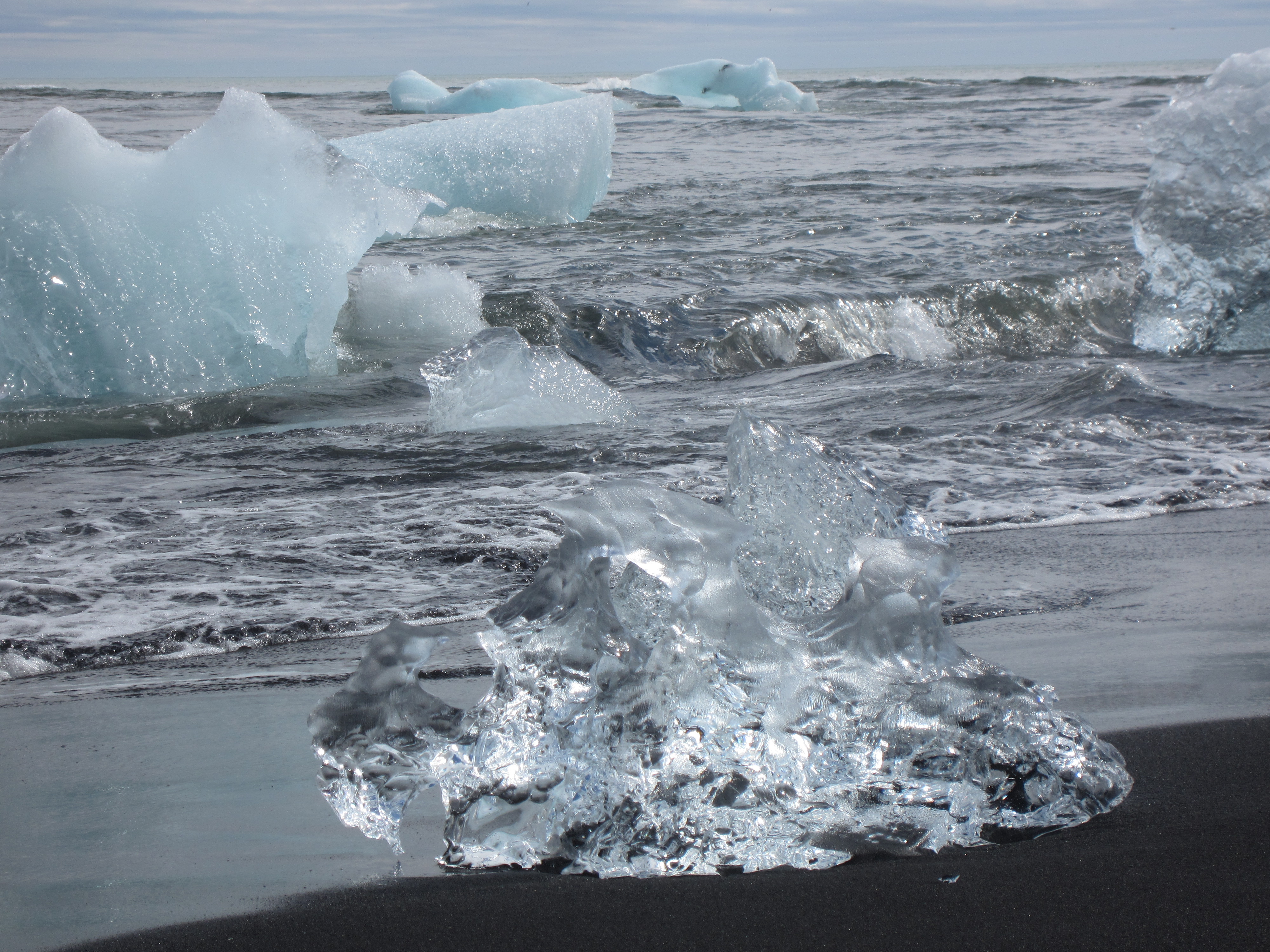 The beach, black as night with volcanic sand, was covered in lumps of ice, collecting on the sand or drifting back and forth in the dark water.