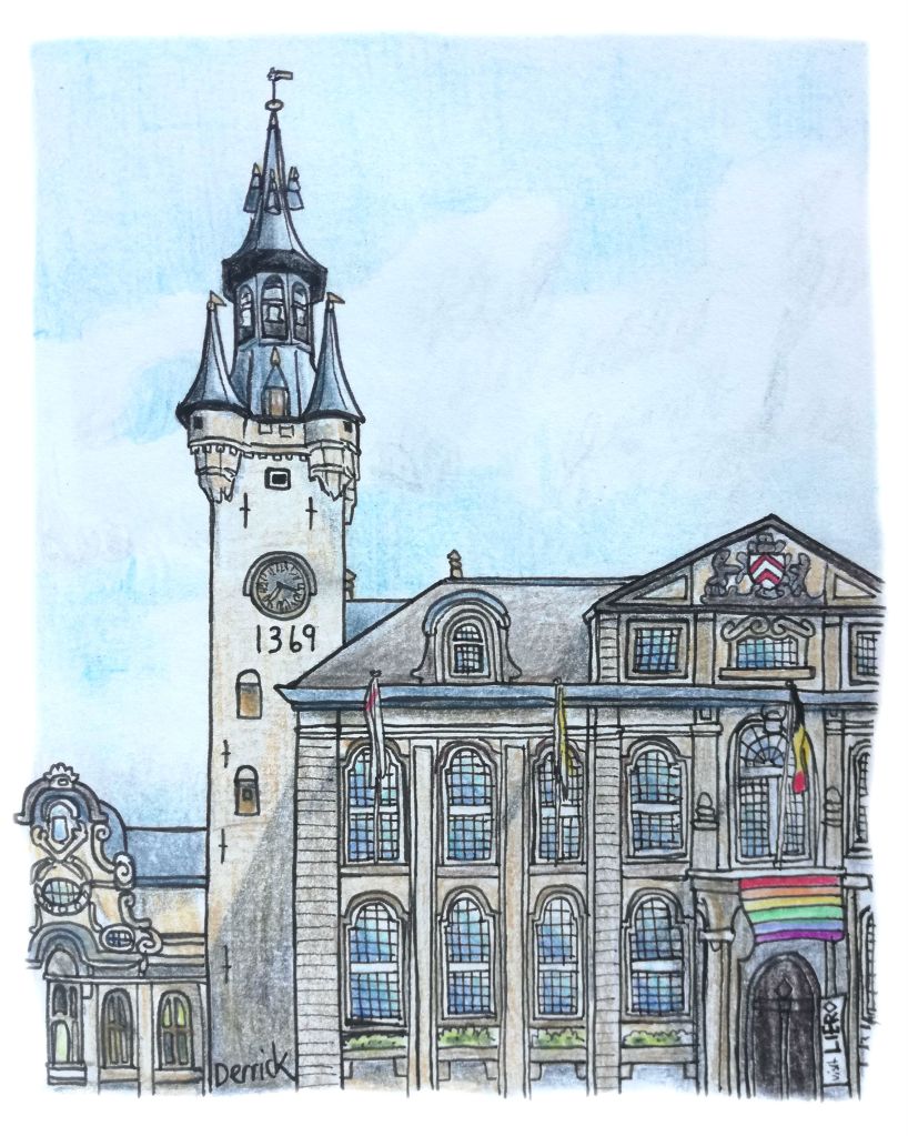 The Belfry is an elegant, slender clocktower, dating to 1369, and the second UNESCO World Heritage site in the city. The numbers 1369 are displayed on the side of the clock tower. For centuries, it stood all by itself. It wasn’t until the 18th century that the Baroque town hall building was built, attached to the Belfry.
