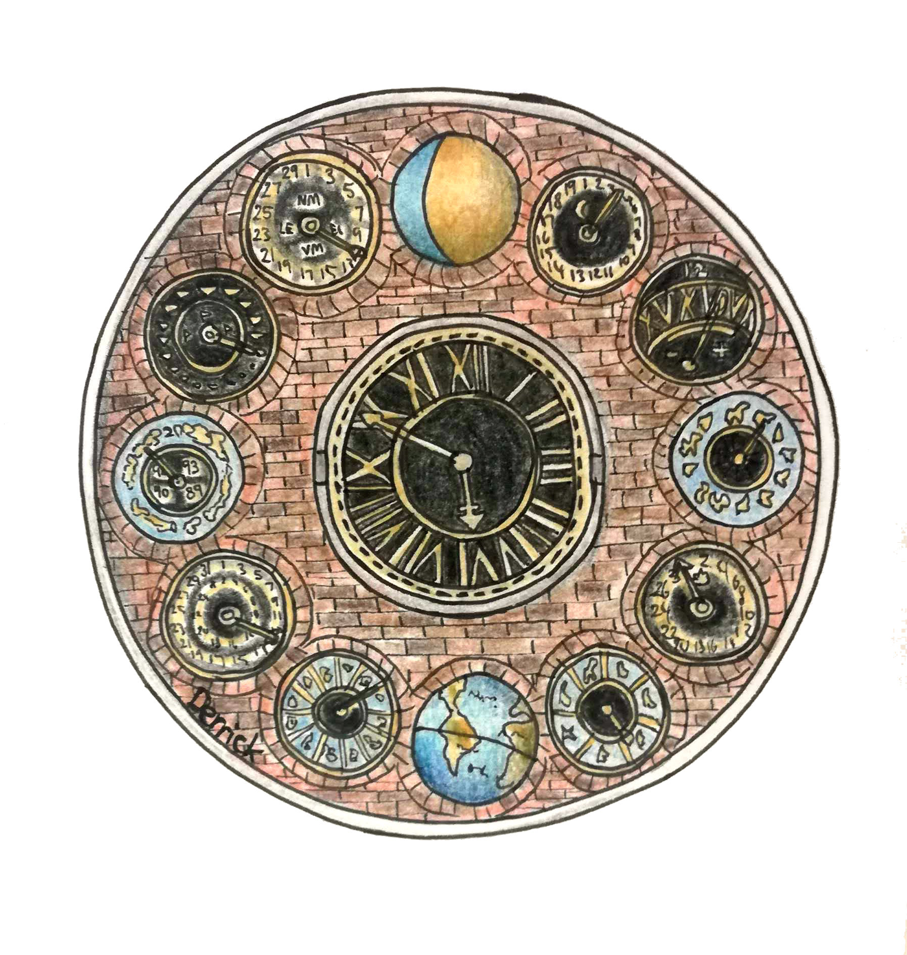 It’s a masterful design – Albert Einstein himself congratulated Zimmer on his wonderful clock – and there’s a lot of information on display. There are 12 special instruments and timepieces arranged around a central clock face. The central clock tells the current time. And what about the smaller clocks? Lets try and decipher them (in clockwise order):