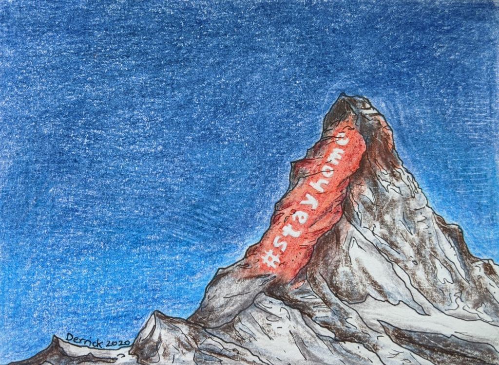 In the shadow of Switzerland’s most famous mountain, the Zermatt ski resort has begun projecting a message onto the jagged peak of the Matterhorn mountain. In red light, artist Gerry Hofstetter shines the word #hope, #stayhome, and the swiss flag onto the pyramid-shaped summit of the mountain.