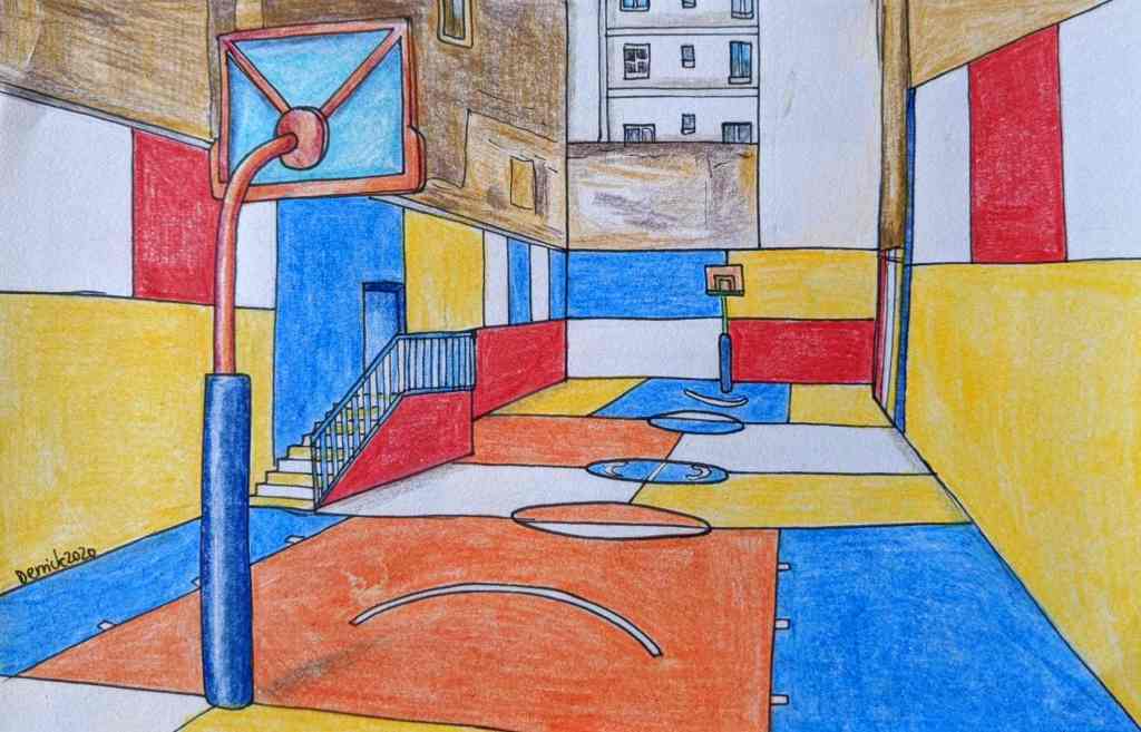 The basketball court is 600 square metres, made with recycled materials equivalent to 45,000 recycled sports shoes. The original design was painted in soft pastel colours of pink, peach and yellow, with dark red and blue markings. The design was completed by Paris-based artist Yué ‘Nyno’ Wu, who painted figures of Michael Jordan, Scottie Pippen, Spike Lee, Grace Jones and LeBron James. LeBrown James attended the inauguration himself when it opened in 2009 (he also returned to visit the court in 2018).