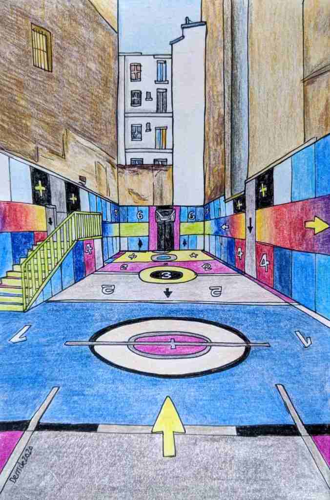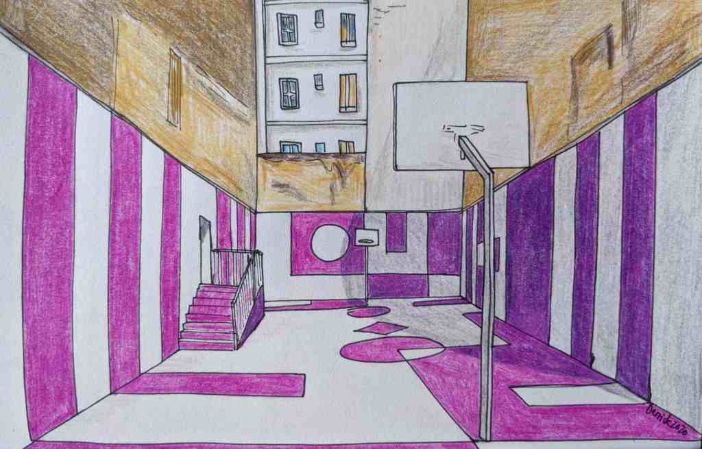 In 2017, the most striking design yet was painted into the Pigalle Duperré basketball court, gradients of electric purples, blues, oranges and yellows. The design was completed with pink plastic backboards and white playing zones. The outside wall was also lowered and replaced with blue mesh, so pedestrians could see inside. The design remains one of the court’s most recognisable, and put Pigalle Duperré on the map.