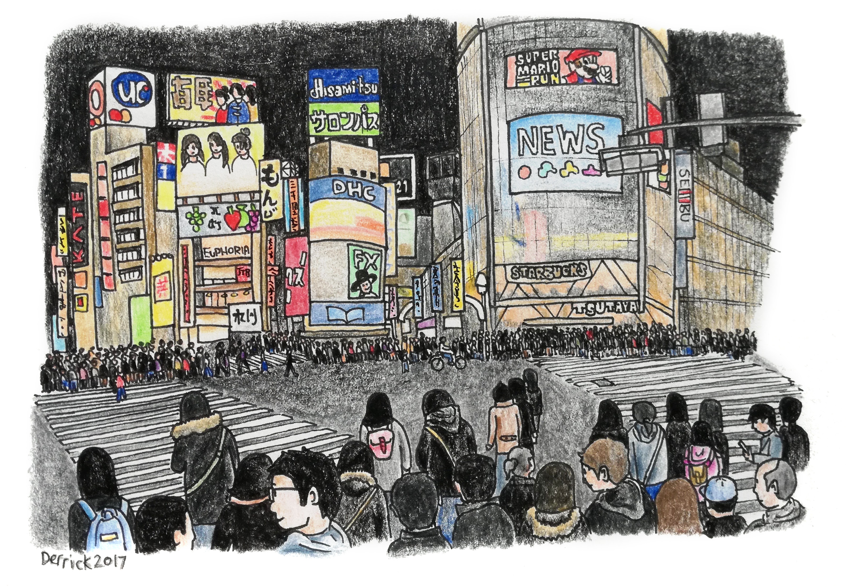 I couldn’t resist drawing a picture of Centre-Gai street in Shibuya. Capturing all the neon lights was a challenge, but I love the frenetic energy of this drawing nevertheless.