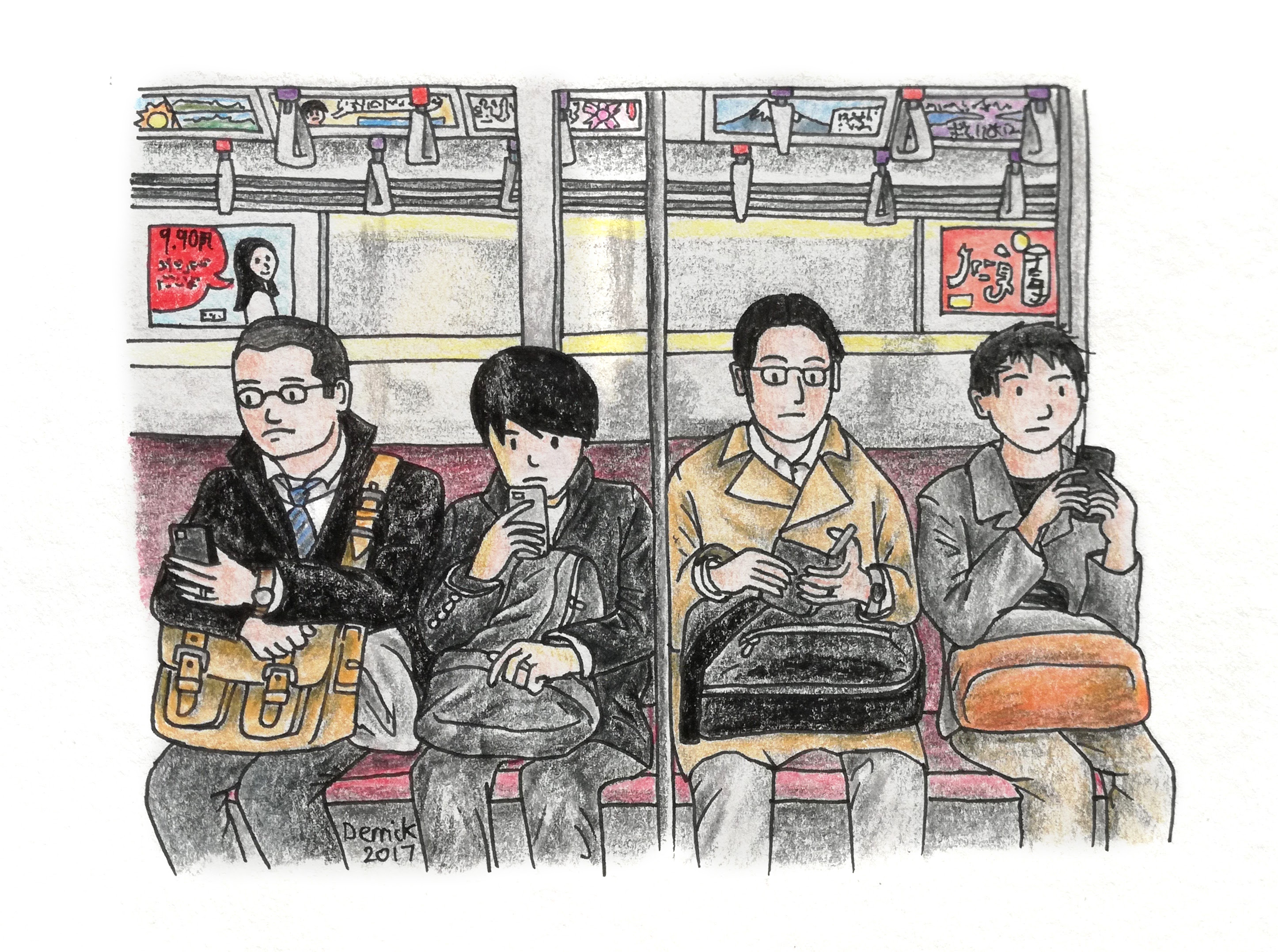 A large part of life in Tokyo is getting around from place to place, and I was thrilled to take the Tokyo subway around the city. Every time I sat opposite a group of people, they were always so interesting. I liked these four men on their way home from work, and their clothing, bags, and hairstyles.