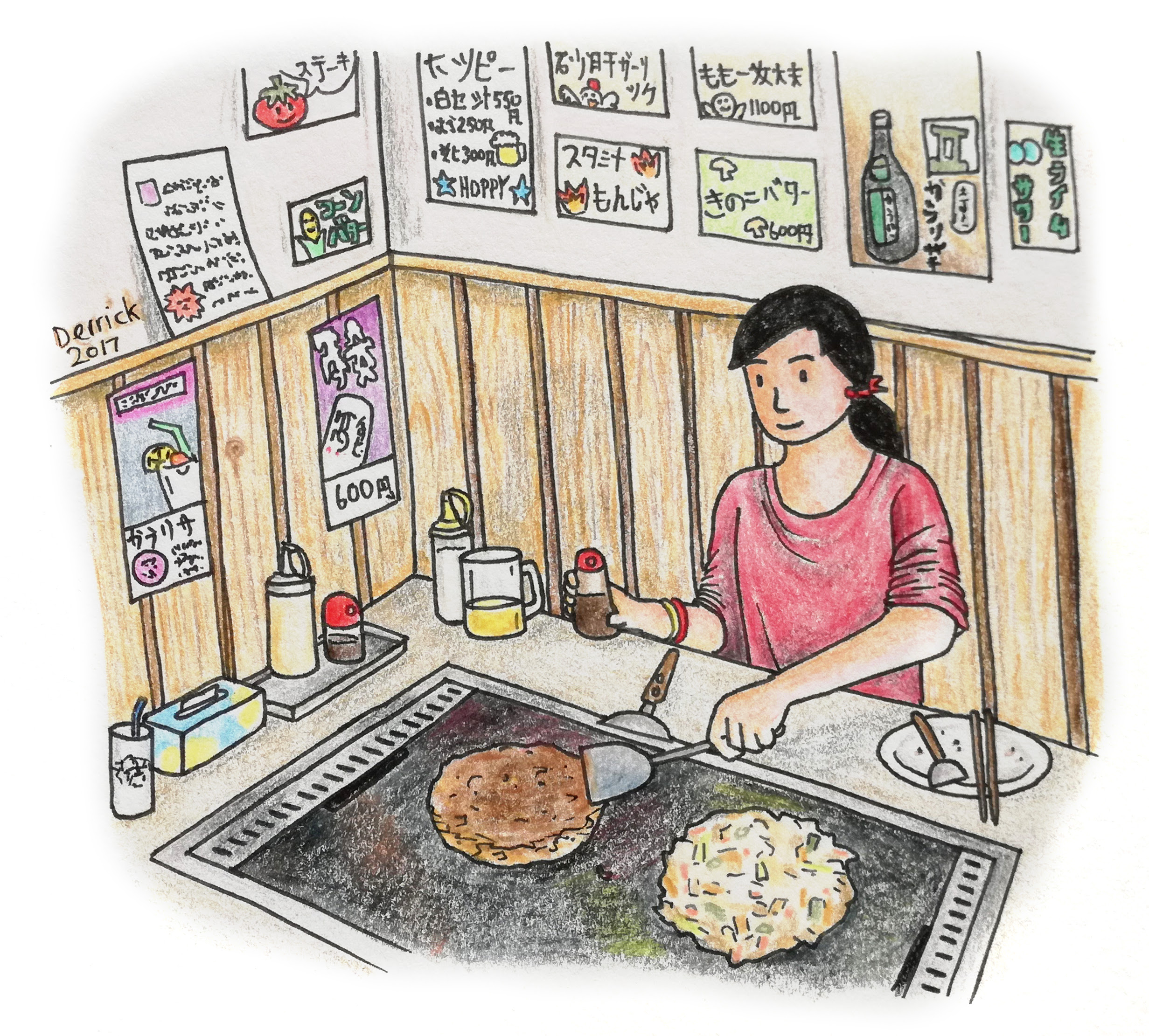 One of the most fun dining experiences in Japan is sitting down to a meal of okonomiyaki, a savoury pancake made with vegetables, flour, egg and meat, and grilled on a hotplate. In this sketch, we visited Tsukishima Monja, a street filled with okonomiyaki restaurants, famous for the Tokyo speciality variation, monjayaki.