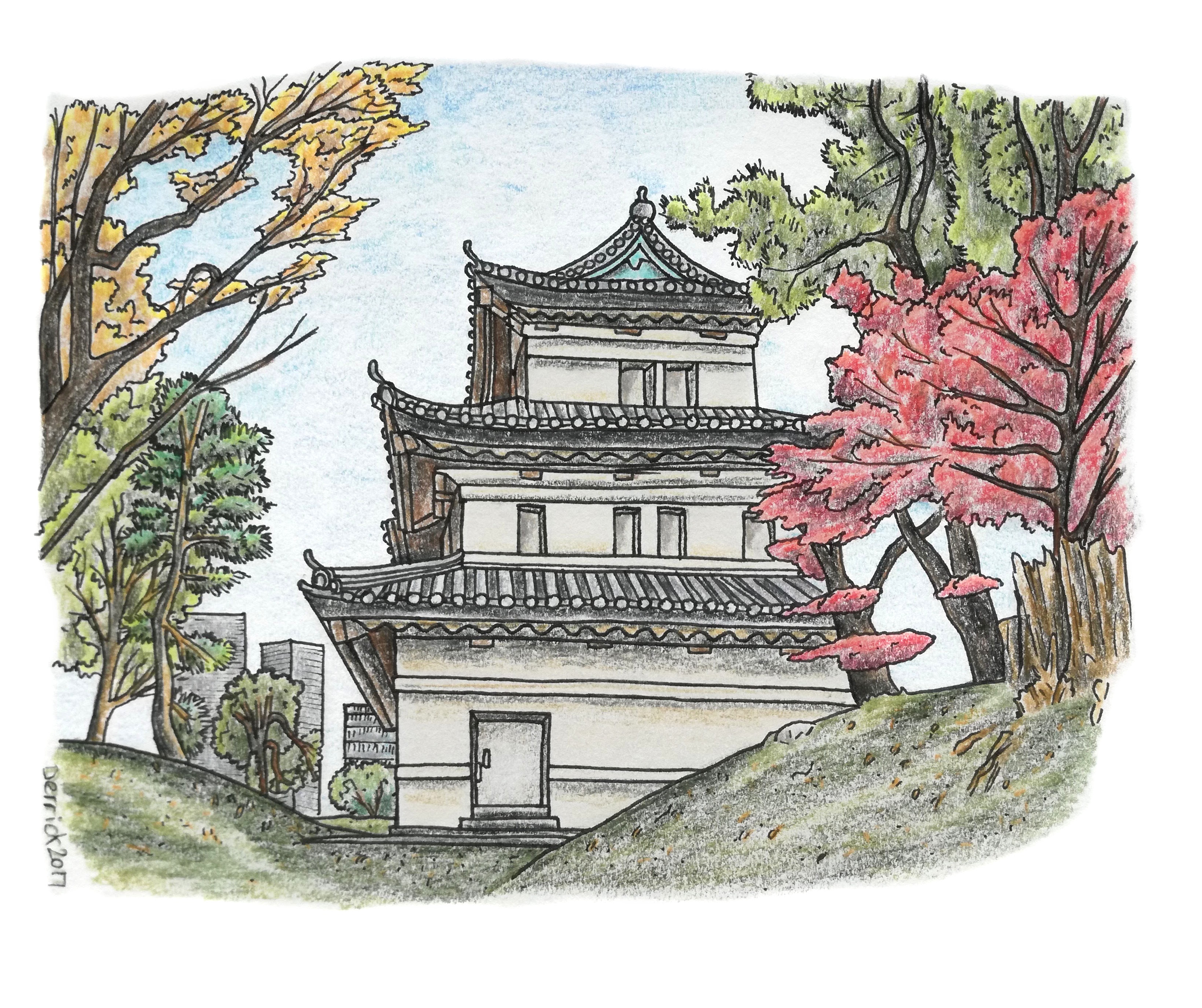 One of my favourite places to sketch was here, at the Imperial Palace of Tokyo. This building is a guard tower near the Imperial palace. I especially loved drawing the different leaf colours that surrounded this scene.