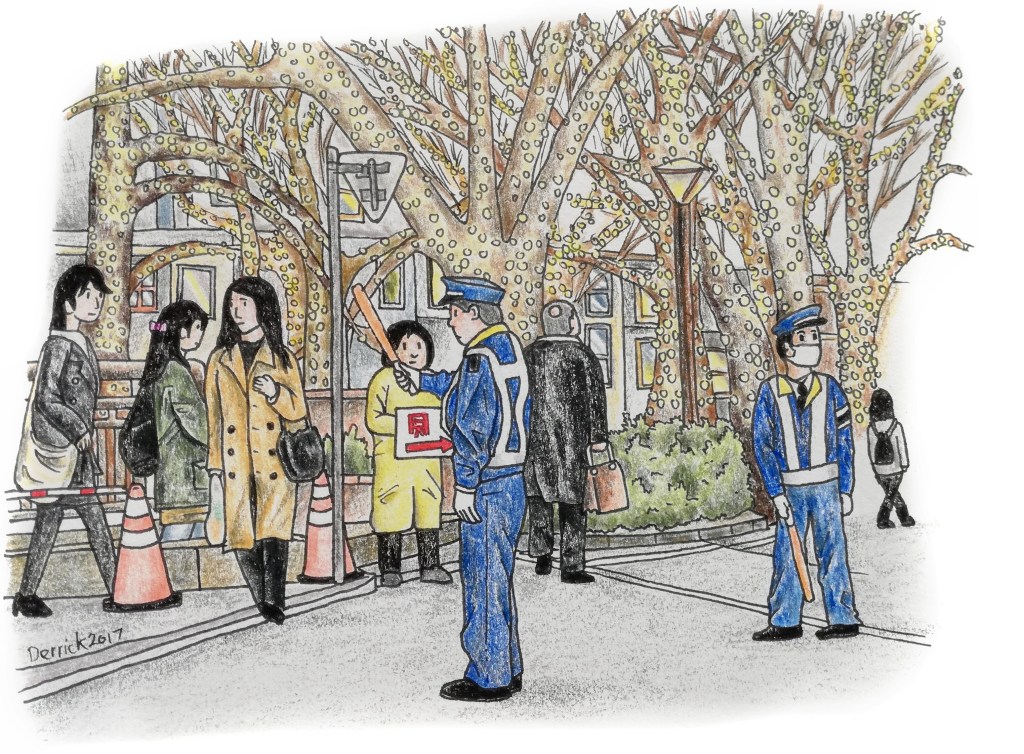 Here, I drew the police officers directing traffic. Lots of people were coming to enjoy the show.